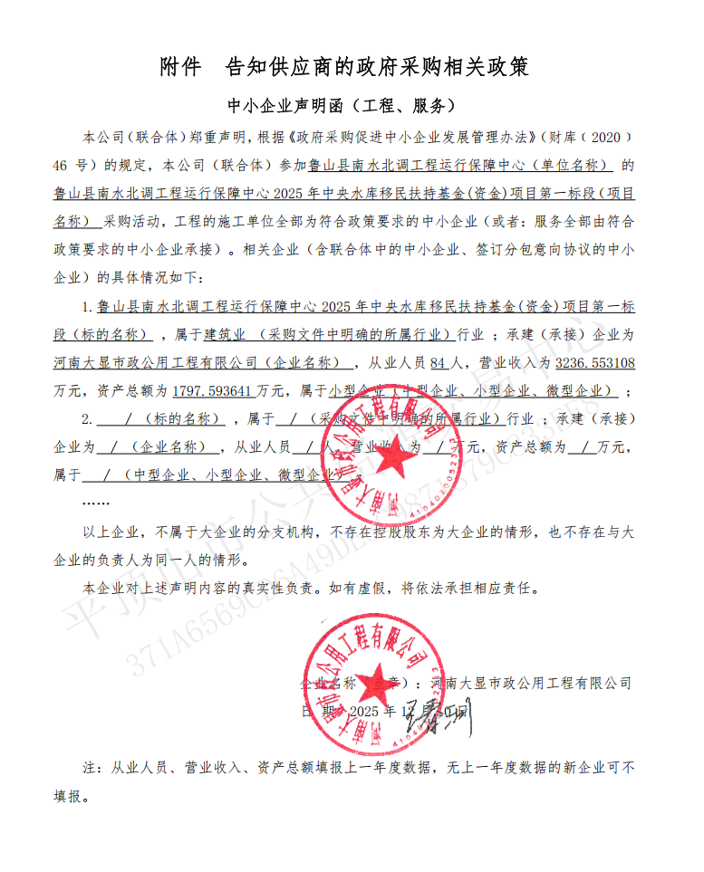 2、采购项目名称:鲁山县南水北调工程运行保障中心2025年中央水库移民扶持基金(资金)项目